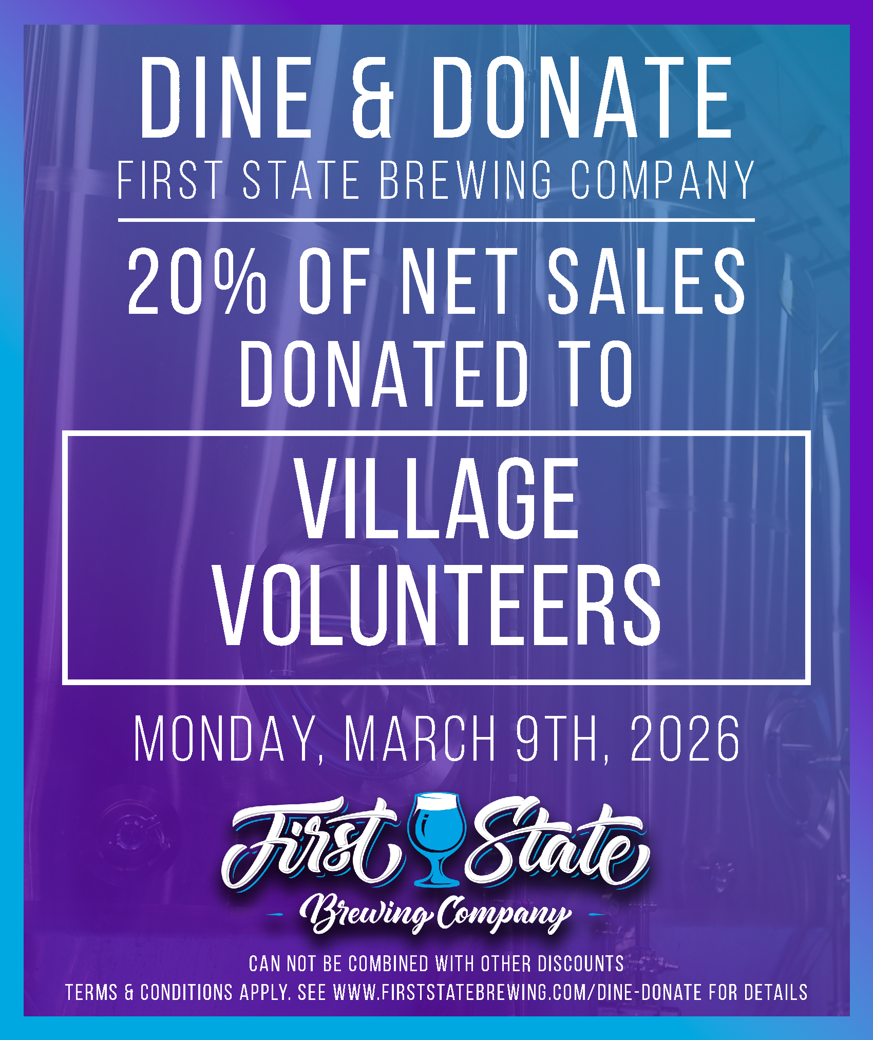 Enjoy delicious food and drinks at First State Brewing Company and 20% of net sales will be donated to Village Volunteers.