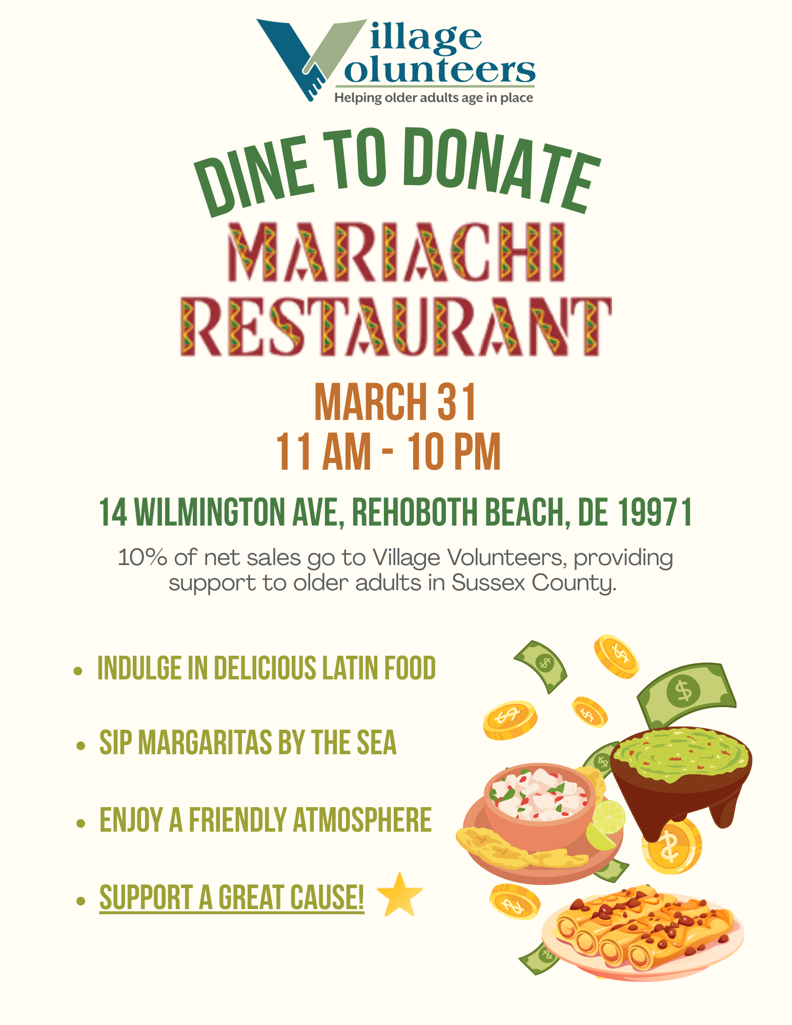 All you need to do is show up any time between 11am and 10pm and order anything on Mariachi's menu. 10% of net sales will go to Village Volunteers, providing support to older adults in Sussex County.