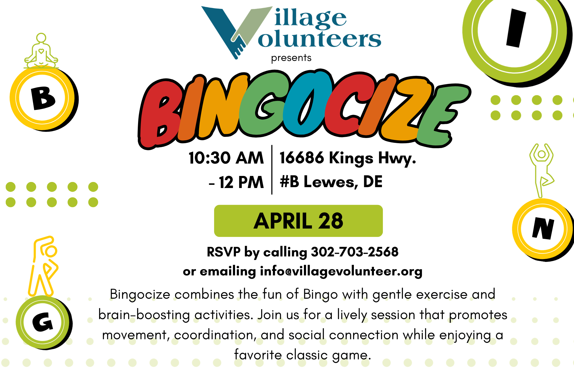 Bingocize is a fun, evidence-based program that combines the classic game of bingo with light exercise and health education. Designed especially for older adults, it promotes physical activity, social engagement, and overall wellness in an enjoyable and interactive group setting.
